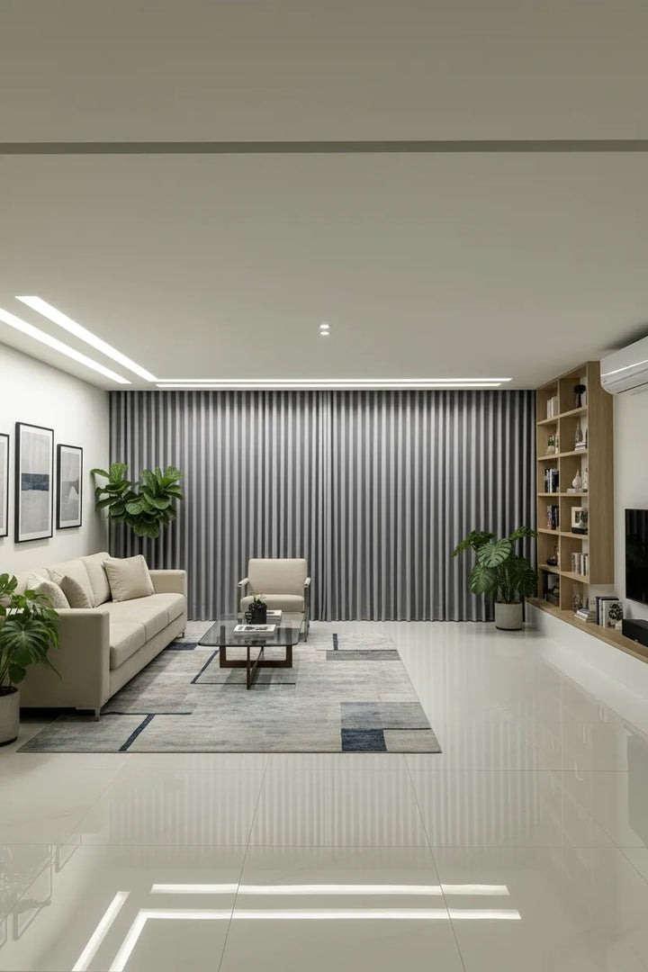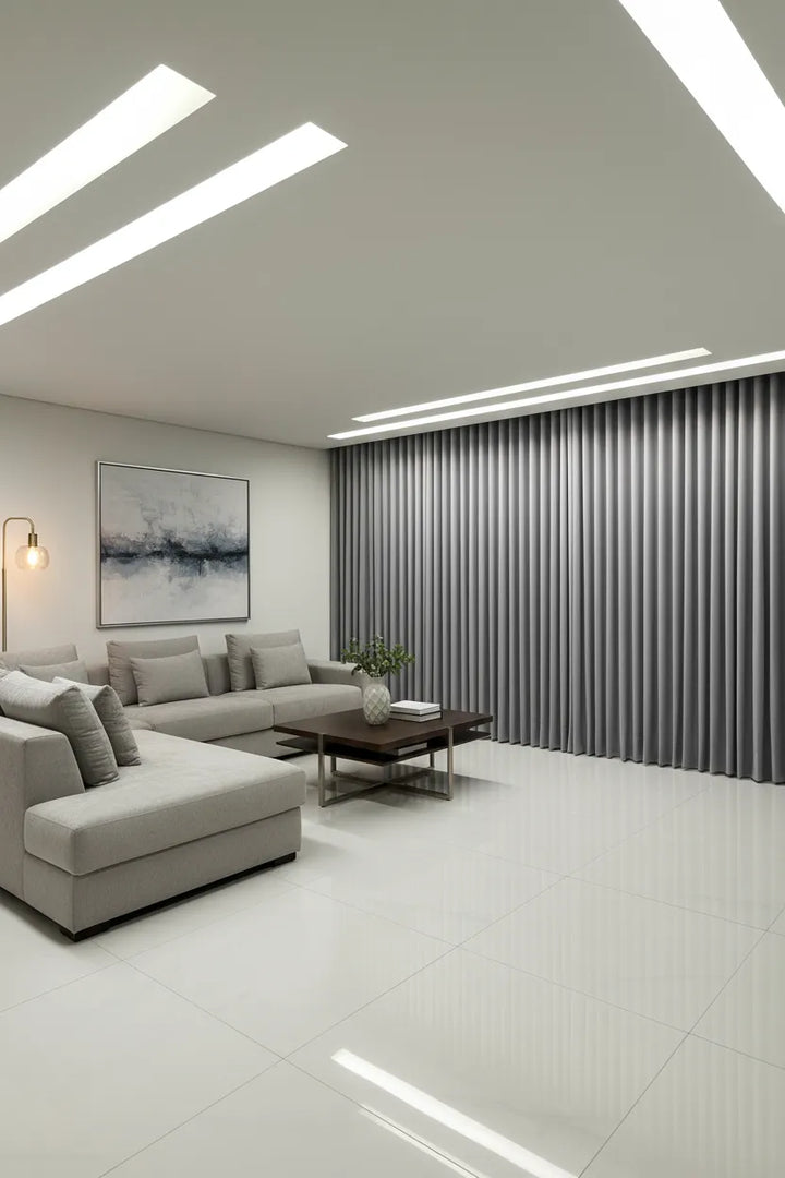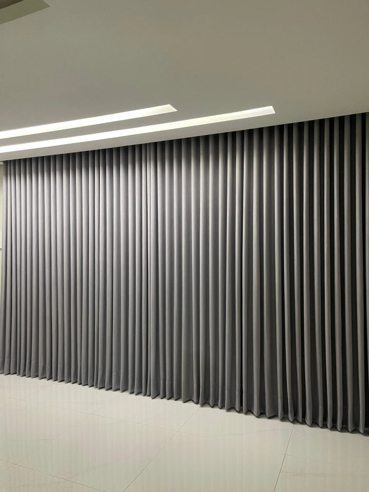 A Cortina em Linho Cinza com Blackout 100% oferece um acabamento premium com caimento fluido graças à prega wave, proporcionando um visual moderno, contínuo e harmonioso para qualquer ambiente.