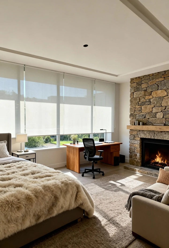 Perfeita para salas, varandas e escritórios, essa cortina une conforto térmico, privacidade e modernidade em uma única peça. O tecido Tela Solar 1% bloqueia até 99% dos raios UV, ajudando a preservar móveis e pisos.