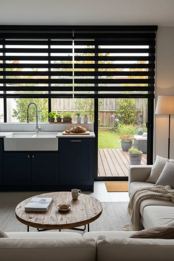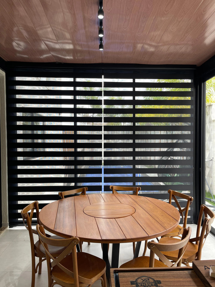 Suas faixas horizontais sobrepostas parecem flutuar entre duas telas perfeitamente alinhadas, garantindo um controle inteligente de luminosidade e visibilidade — ideal para quem busca elegância e conforto no dia a dia.