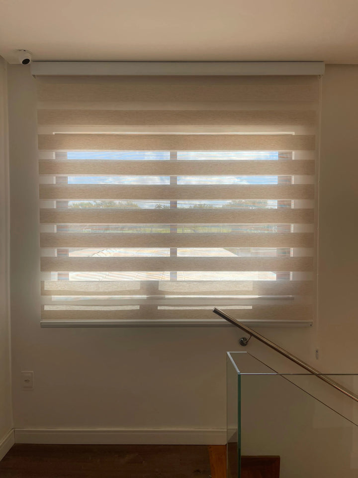 Suas faixas horizontais sobrepostas parecem flutuar entre duas telas perfeitamente alinhadas, garantindo um controle inteligente de luminosidade e visibilidade — ideal para quem busca elegância e conforto no dia a dia.