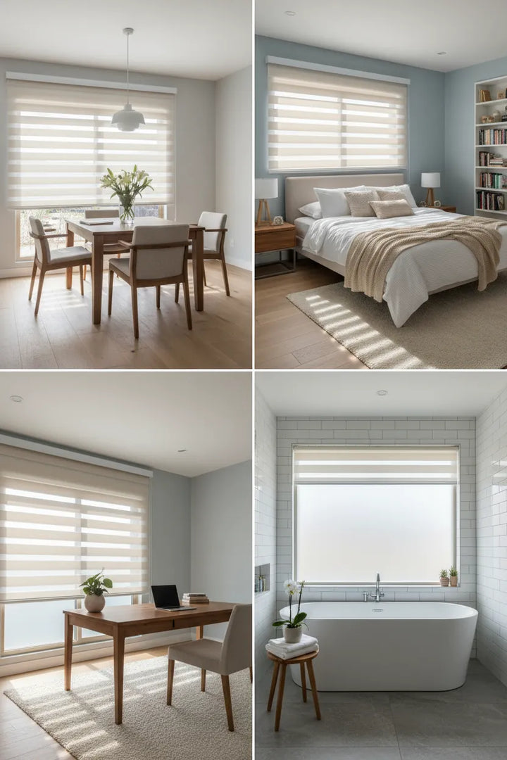 A persiana Double Vision é indicada para salas, corredores, quartos e espaços corporativos que desejam aproveitar a entrada de luz natural difusa sem abrir mão da privacidade.